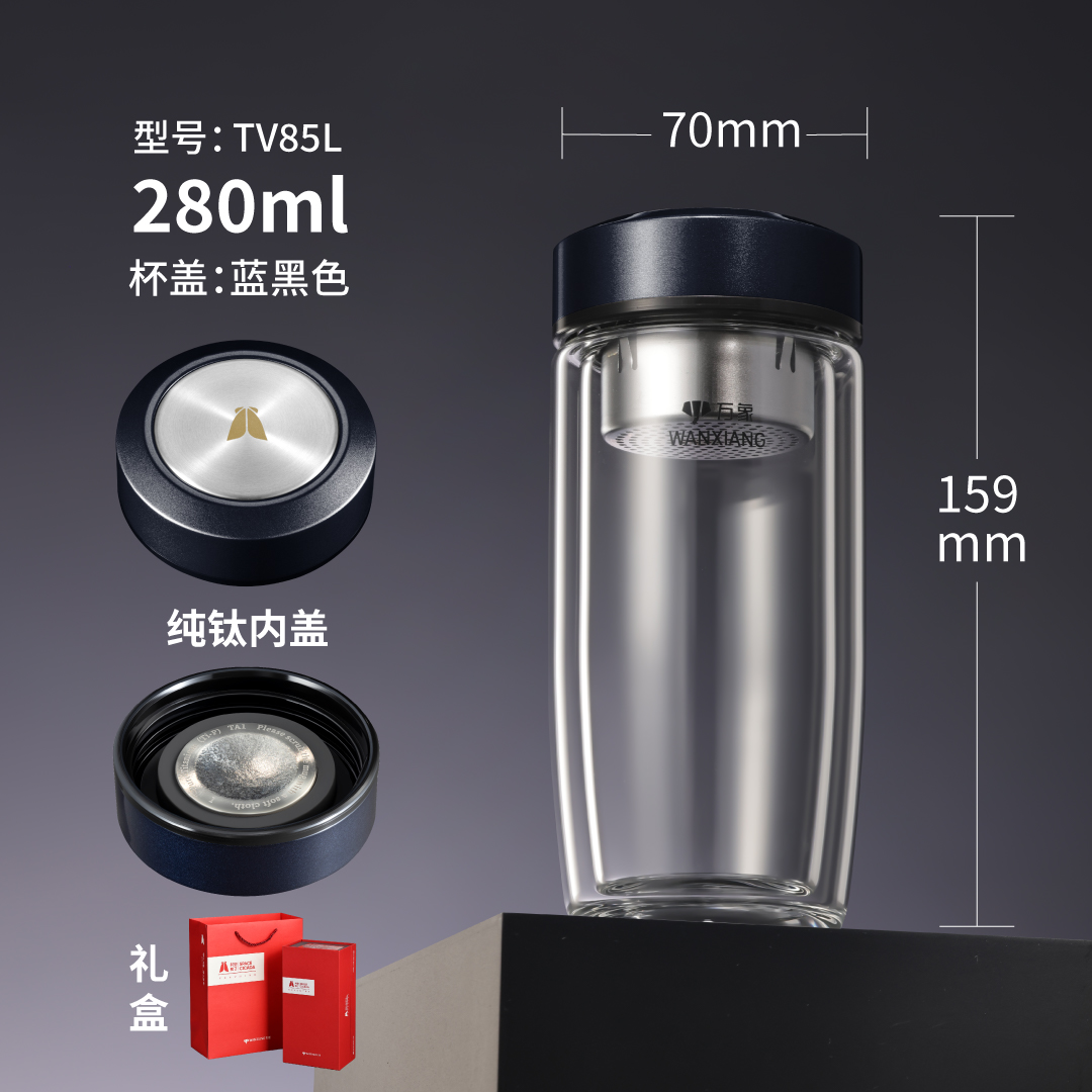 時空知了雙層鵝蛋純鈦內蓋玻璃杯TV85L-藍黑色 :¥155 TV86L-藍黑色 :¥165